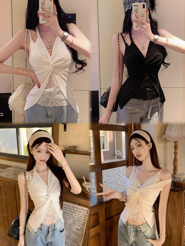 Women's Sexy Lace Halter Top with Padded Bust - Slimming Faux Two-Piece Versatile Tank