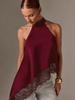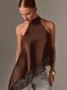 Experience elegance and comfort with this Women's Summer Satin Halter Top. Perfect for warm weather, this top is crafted from luxurious acetate fabric, offering a smooth and silky feel. The design features a chic solid pattern and delicate lace trim that adds a touch of sophistication. Ideal for a stylish summer look, this halter top is a versatile piece for various occasions.