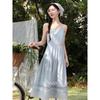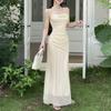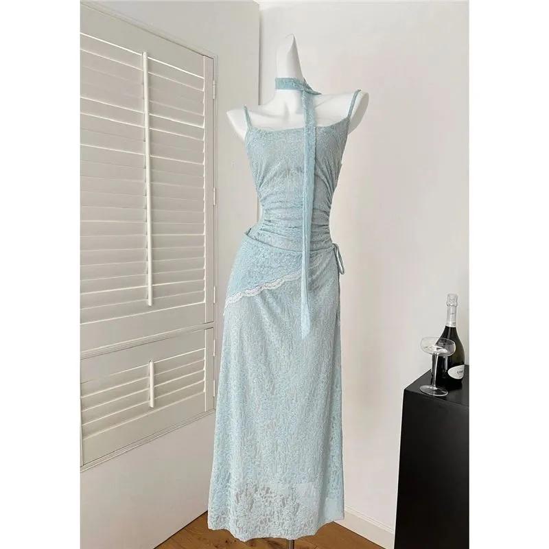 Women Summer Spaghetti Strap Midi Dress Ruched Lace Trim Casual Dress