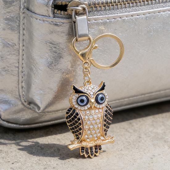 This exquisite owl keychain features a durable alloy electroplating process, ensuring long-lasting color that resists fading. Adorned with vibrant rhinestones and colorful enamel wings available in pink, blue, black, or red, it sparkles brilliantly under light.