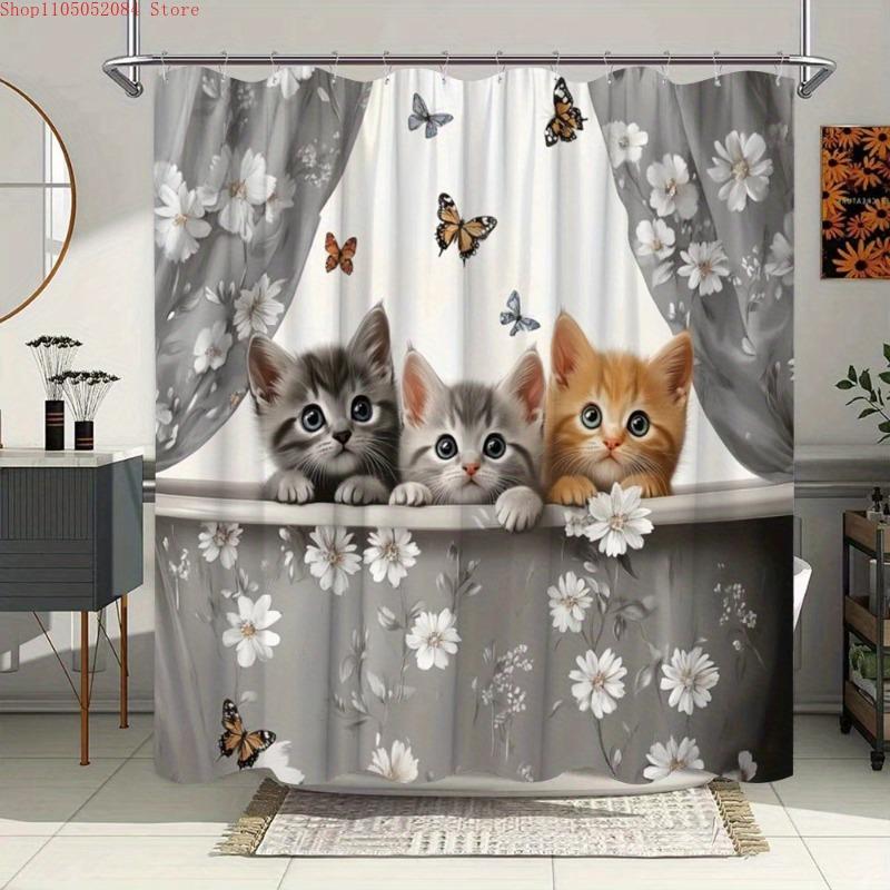 1pc adorable cats shower curtain polyester fabric watercolor - With Hooks Waterproof Mildew Proof Easy Install Washable