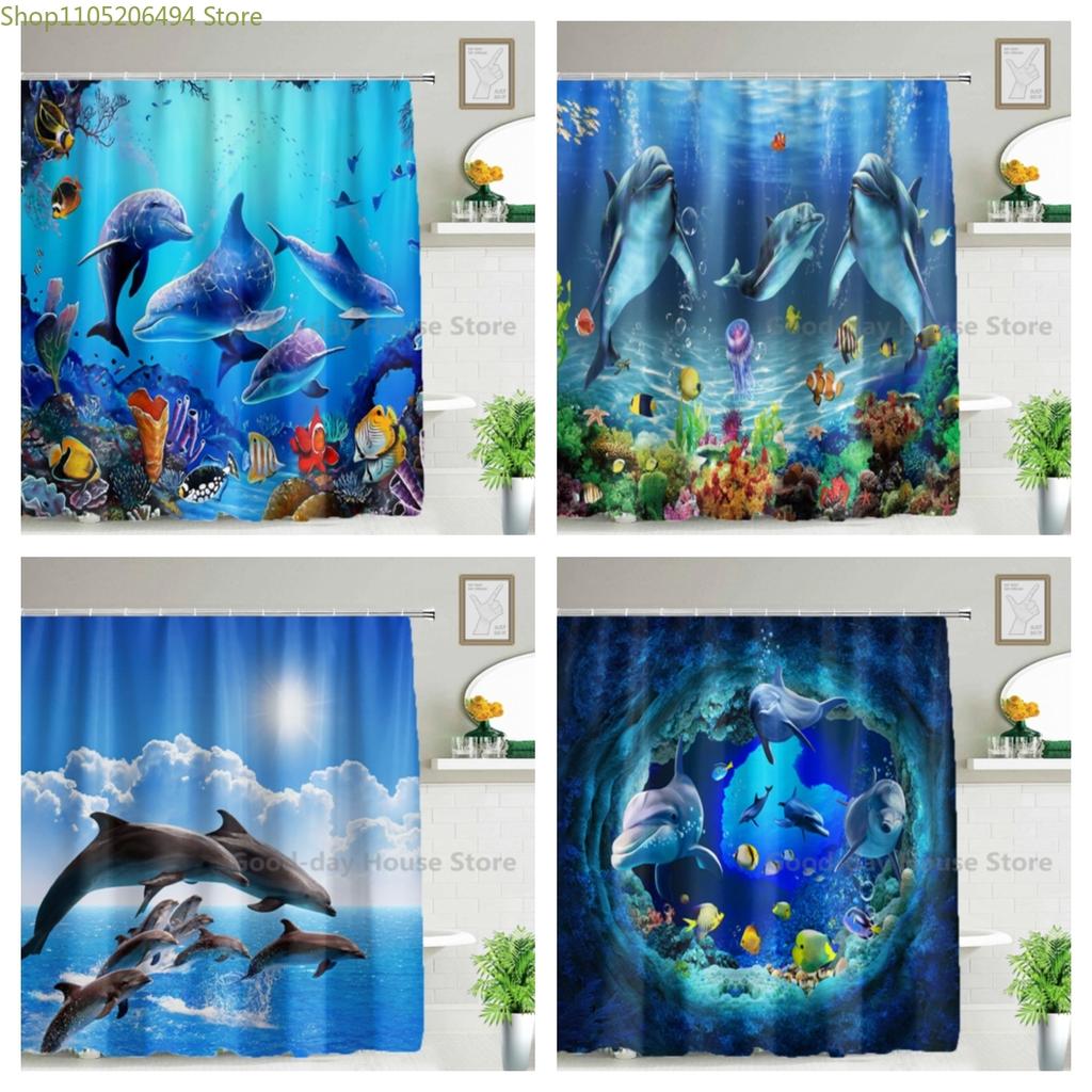 3D Dolphin Bathroom Shower Curtain Waterproof Polyester Fabric Kids Bath Curtain with 12 Hooks Cute Cortinas Washable Home Dec