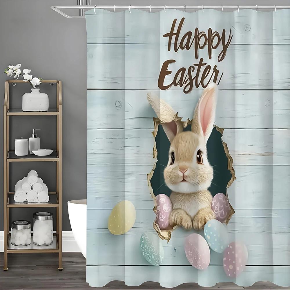 Happy Easter Bunny Eggs in Wooden Board Hole Shower Curtain, Bathroom Decorative Shower Curtain, Waterproof Shower Curtain with