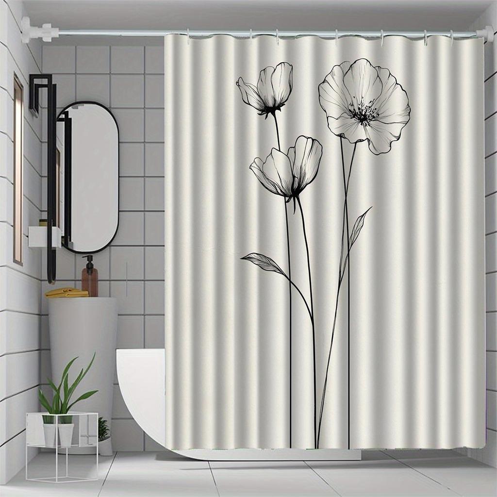 Floral Shower Curtain, Artistic Black & White Flowers, Polyester, Machine Washable with Hooks