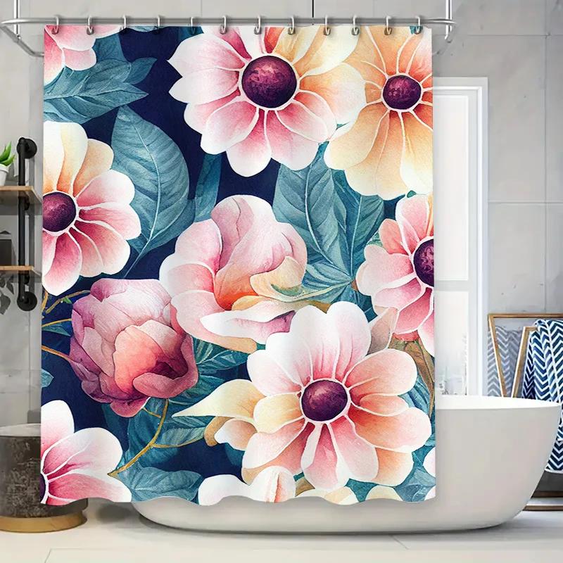 Beautiful Floral Print Shower Curtain Waterproof Home Decor Bathroom Wall Hanging for Living Room Pink Blossoms on Blue Backgrou