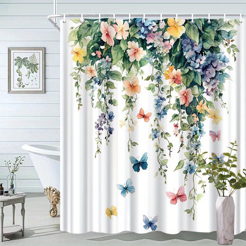 1pc Watercolor Style Butterfly and Floral Shower Curtain with Vivid Natural Plant Print, Polyester Fabric Including 12 Hooks