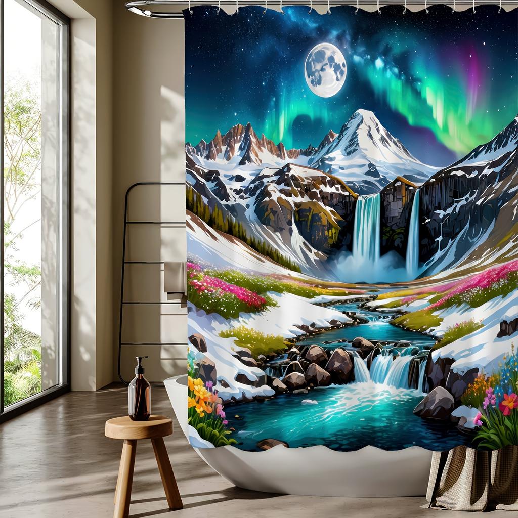Snow Mountain Aurora Landscape Digital Print Shower Curtain , Reversible Polyester, All-Season Bathroom/Home Decor
