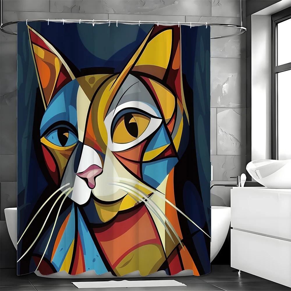 Abstract Art Cat Shower Curtain, Bathroom Decorative Shower Curtain, Waterproof Shower Curtain with Hooks