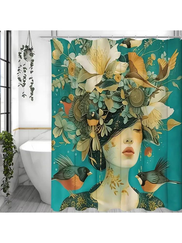 Abstract Art Flower and Bird Girl Design, Shower Curtain, Bathroom Decorative Shower Curtain, Waterproof Shower Curtain with Hoo