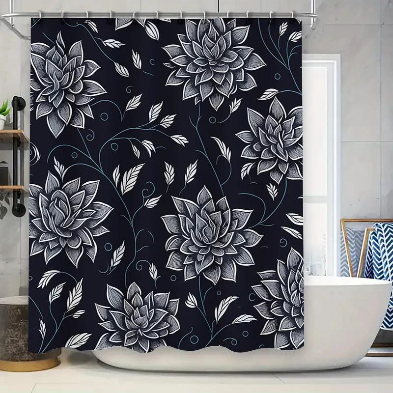 Black Floral Printed Shower Curtain Decorative Bathtub Liner for Bathroom Waterproof Hanging Shower Curtain with Rod (180x240cm)