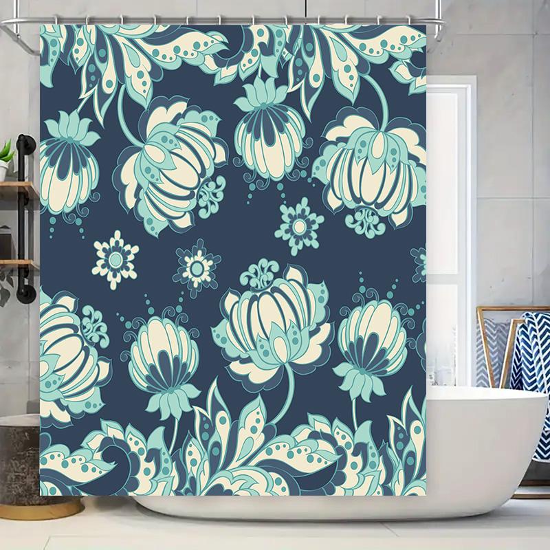Modern Blue Floral Shower Curtain Set Waterproof Fabric Printed Decorative Home Bath Bathroom Decoration for Kids, Adults Senior