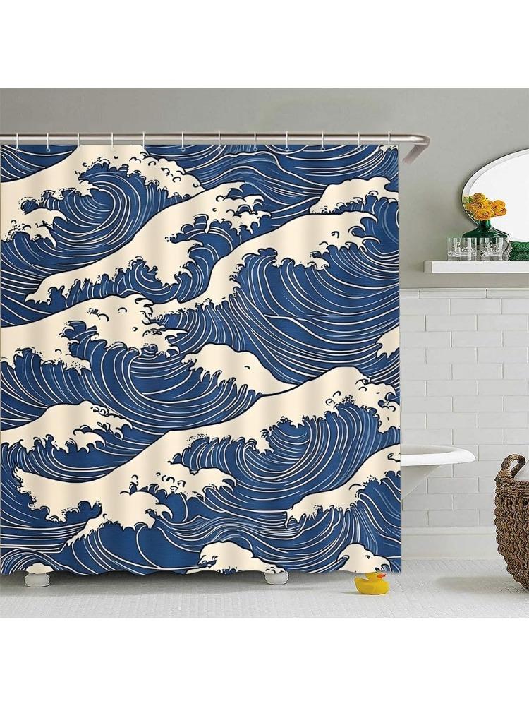 Japanese Wave Shower Curtain Abstract Kanagawa Oriental Ocean Sea Waves Creative Geometric Comic Antique Bathroom Curtain