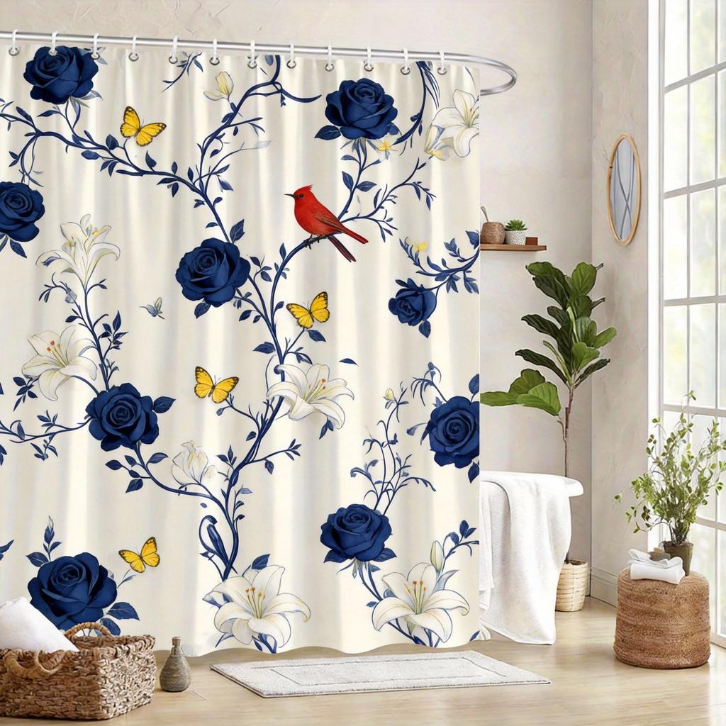 Vintage Botanical Shower Curtain 180x180cm – Blue Branches with Birds, Timeless Floral Bathroom Decor Gift, 12 Hooks