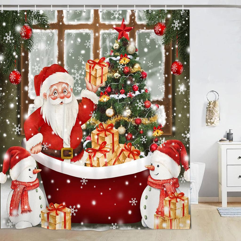 Funny Santa Claus Snowman Christmas Shower Curtain with Red Gold Tree Design, New Year Bathroom Decor for Festive Celebration