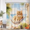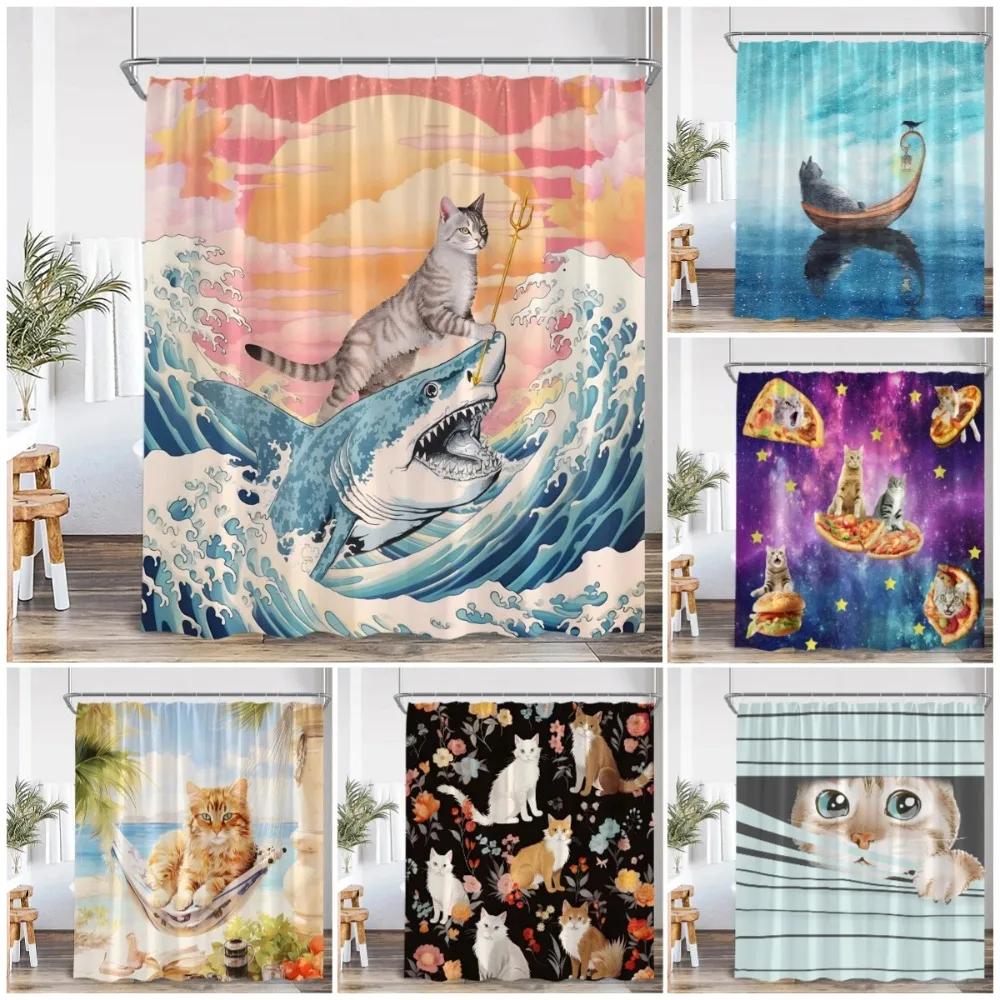 Funny Cat Shower Curtain Cat Riding Shark Dinosaur Flower Floral Polyester Bathtub Curtain Space Planet Bathroom Decor with Hook