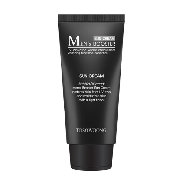TOSOWOONG Men's Booster Sun Cream delivers professional-grade UV protection with SPF50+ and PA+++ to shield against harmful ultraviolet rays while maintaining a lightweight, non-greasy finish. The formula applies clear without cloudiness, ensuring a natural appearance on all skin tones.