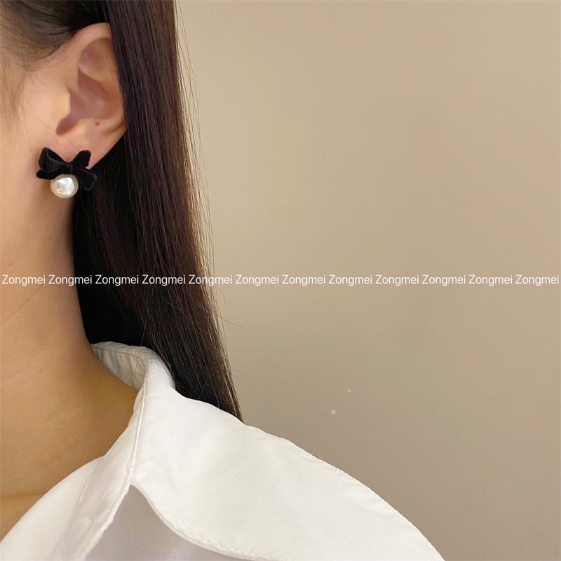 2026 Trendy Velvet Pearl Bow Earrings for Women - High-End Niche Design in Black