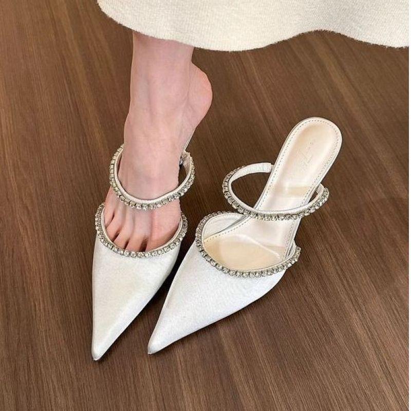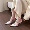 2025 new rhinestone one-word shallow high heels fashion versatile spring and summer pointed thin heel medium heel half slippers women
