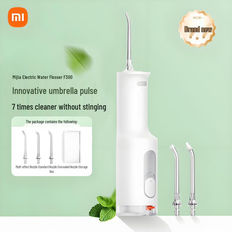 The Xiaomi MI F300 Water Flosser is designed for effective oral hygiene, featuring cloud-feel umbrella pulse technology for a gentle yet thorough clean. It comes with 3 different nozzles and is suitable for sensitive teeth, making it ideal for home use, especially as an orthodontic set.