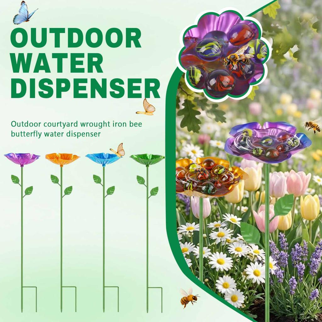 Outdoor Courtyard Wrought Iron Bee Butterfly Water Dispenser, Flower Four Color Set, Bird Feeder, Garden Decoration Ornament, Flower Ground Insert