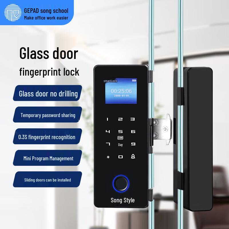 The GEPAD A5S Smart Fingerprint Glass Door Lock offers advanced security for offices, bedrooms, and studies. Featuring multiple unlocking methods including semiconductor fingerprint, password, and card access, this anti-theft smart lock is designed for both single and double glass doors. No network connection is required for operation.