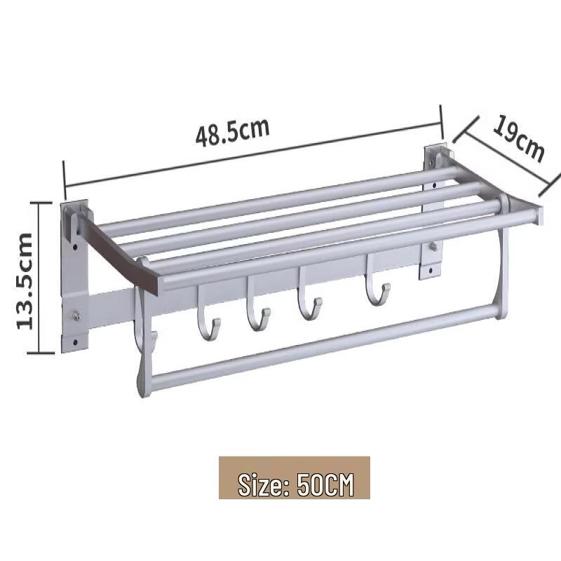 This cmaos bathroom towel rack features an integrated storage shelf and a 50cm length, making it ideal for organizing towels and bath essentials. Constructed from durable space aluminum, it is designed for secure screw wall-mounted installation, offering a robust and long-lasting storage solution for your bathroom.