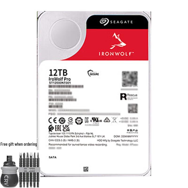Seagate IronWolf Pro 12TB NAS Hard Drive with 7200 RPM, 256MB Cache, and SATA interface, featuring PMR CMR vertical technology. Includes a screwdriver and SATA cable set.