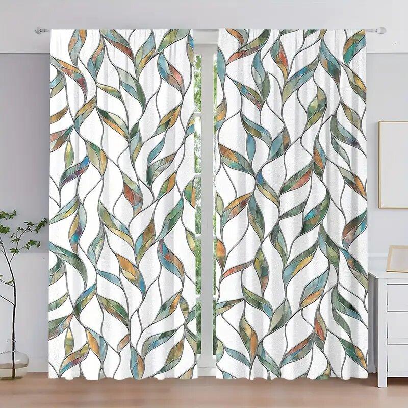 Set Of 2 Colored Imitation Glass Leaf Pattern Printed Curtains Window Decoration Home Room Curtain Polyester