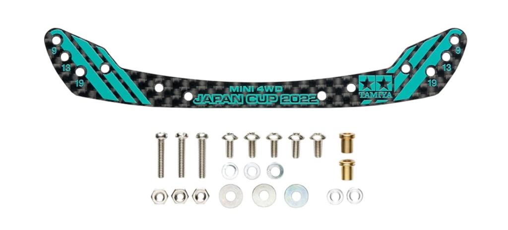 The design features a racy carbon pattern with the Tamiya logo, J-CUP logo, and stripes printed in blue-green.