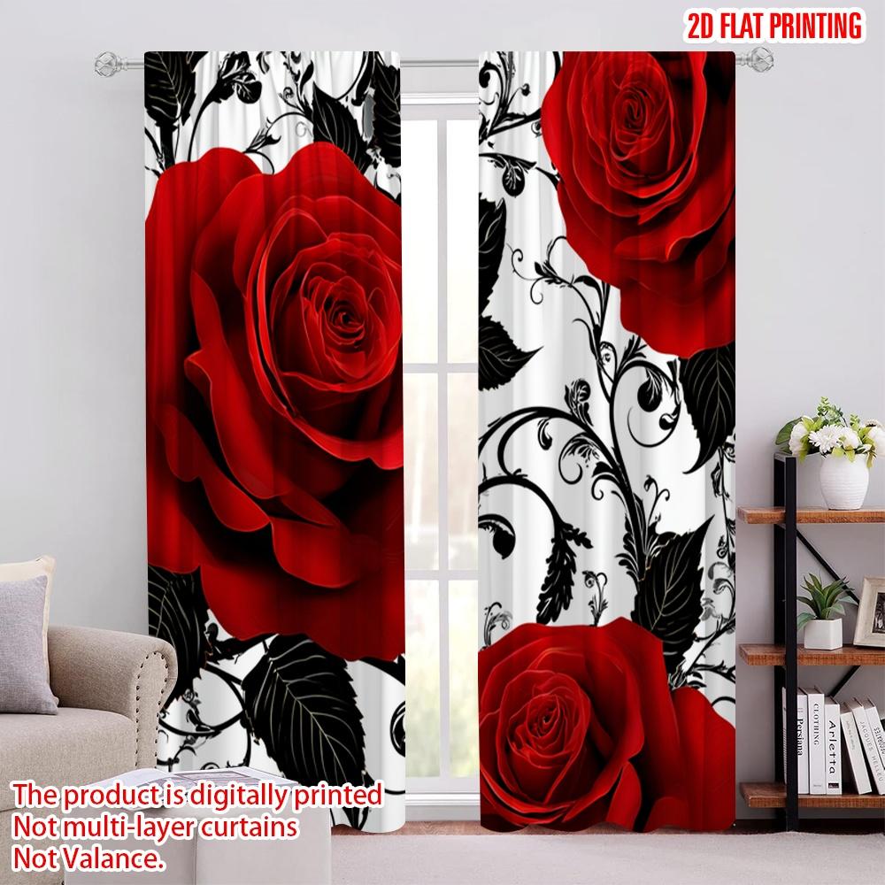 Set Of 2 Flat Printing Curtains Red Roses Black Swirls Floral Digital Printed Polyester Drapes Seasonal Party Holiday Decor Curtain