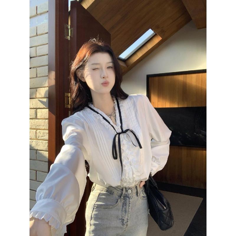 Retro V-neck tie bow blouse for women, spring and summer long-sleeve design with ruffled lace top