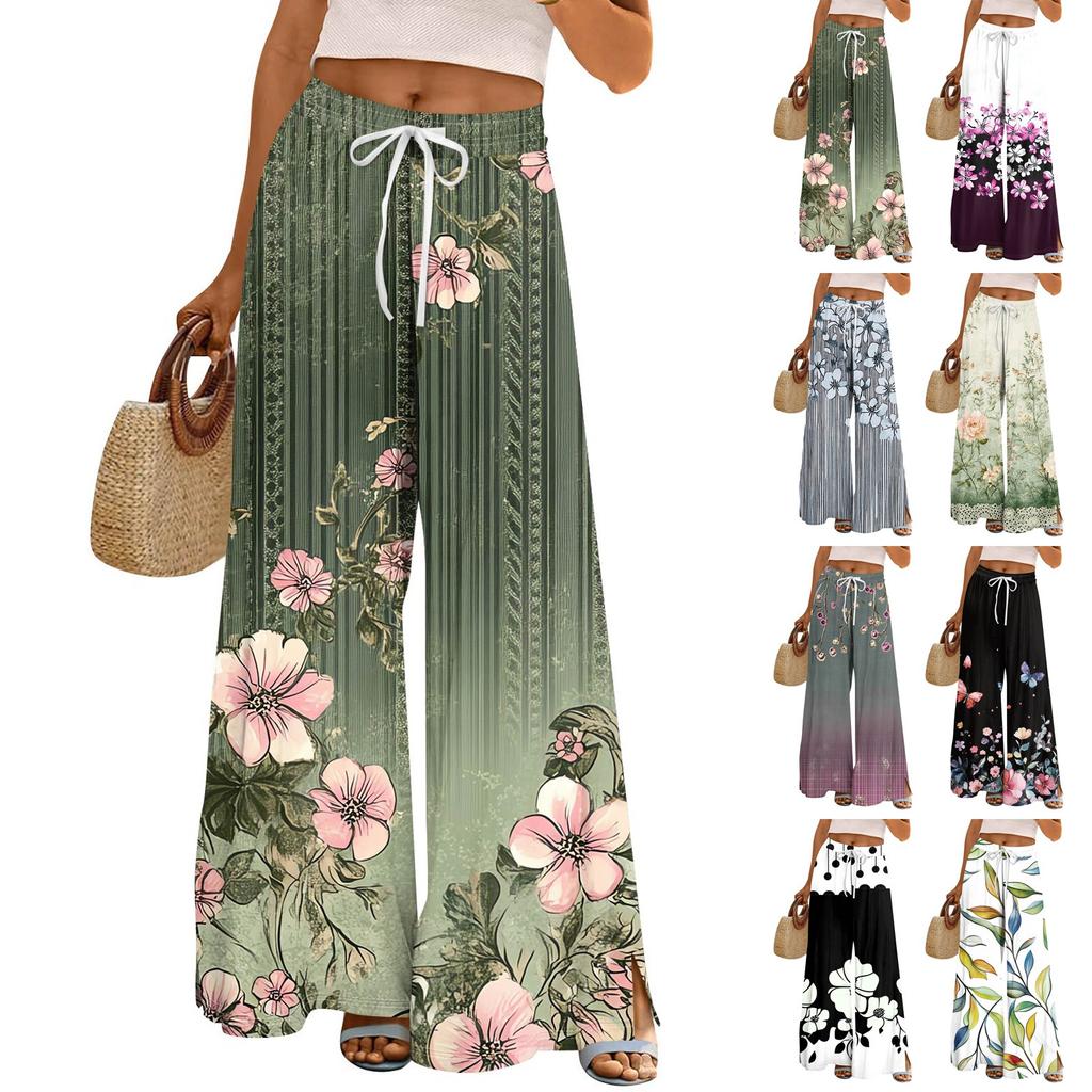 Women's Printed Wide Leg Pants With Pockets High Waist Drawstring Loose Casual Pants