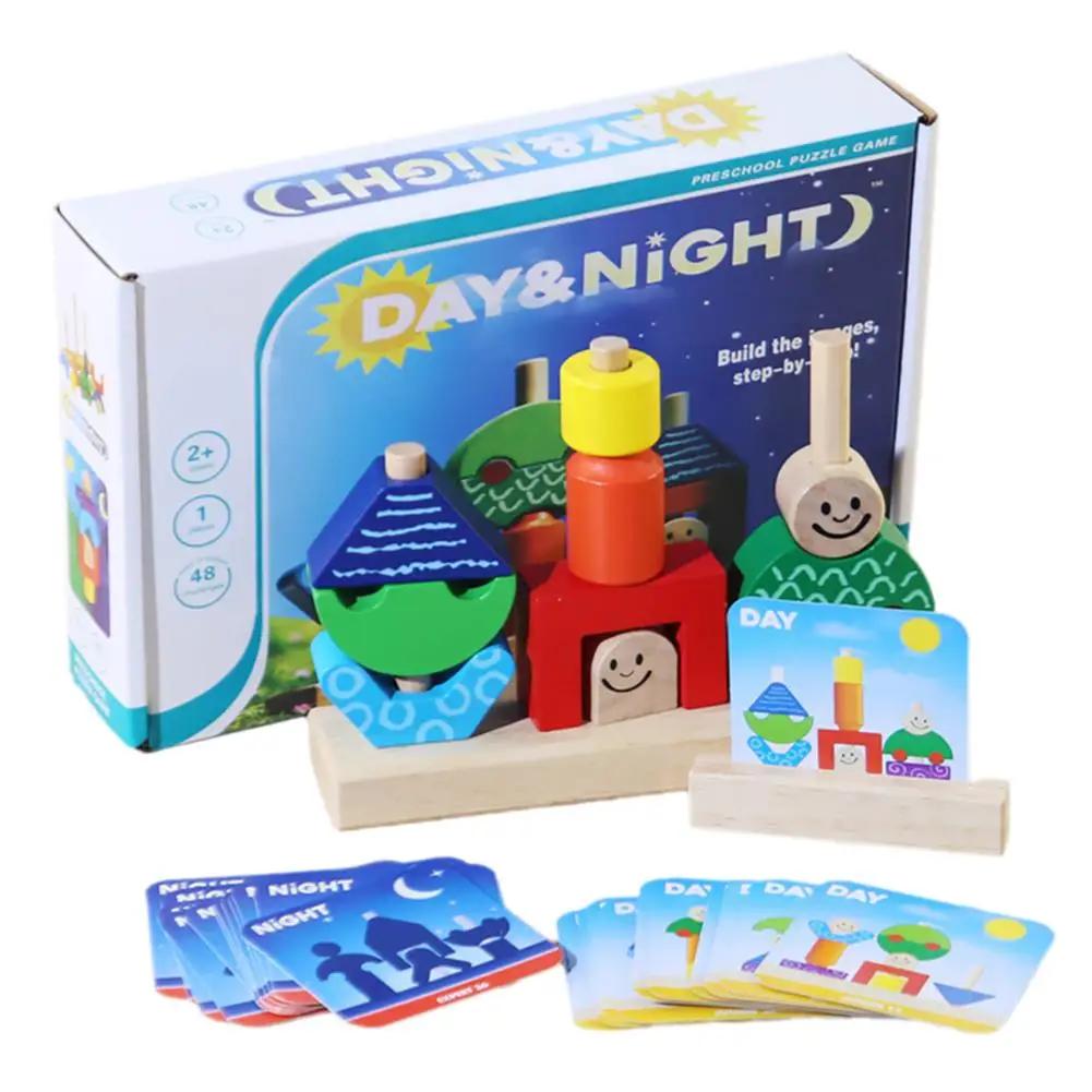 Wooden Blocks Stacked Shape Matching Game Logical Thinking Training Themed Games Creative Puzzle Day/Night Kids Toys H2A4