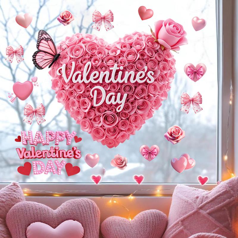 יום האהבה רומנטי אדום ורוד ורד צורת לב מדבקות לחלון קישוט אווירה חגיגית למסיבה לבית לחנות למסעדה