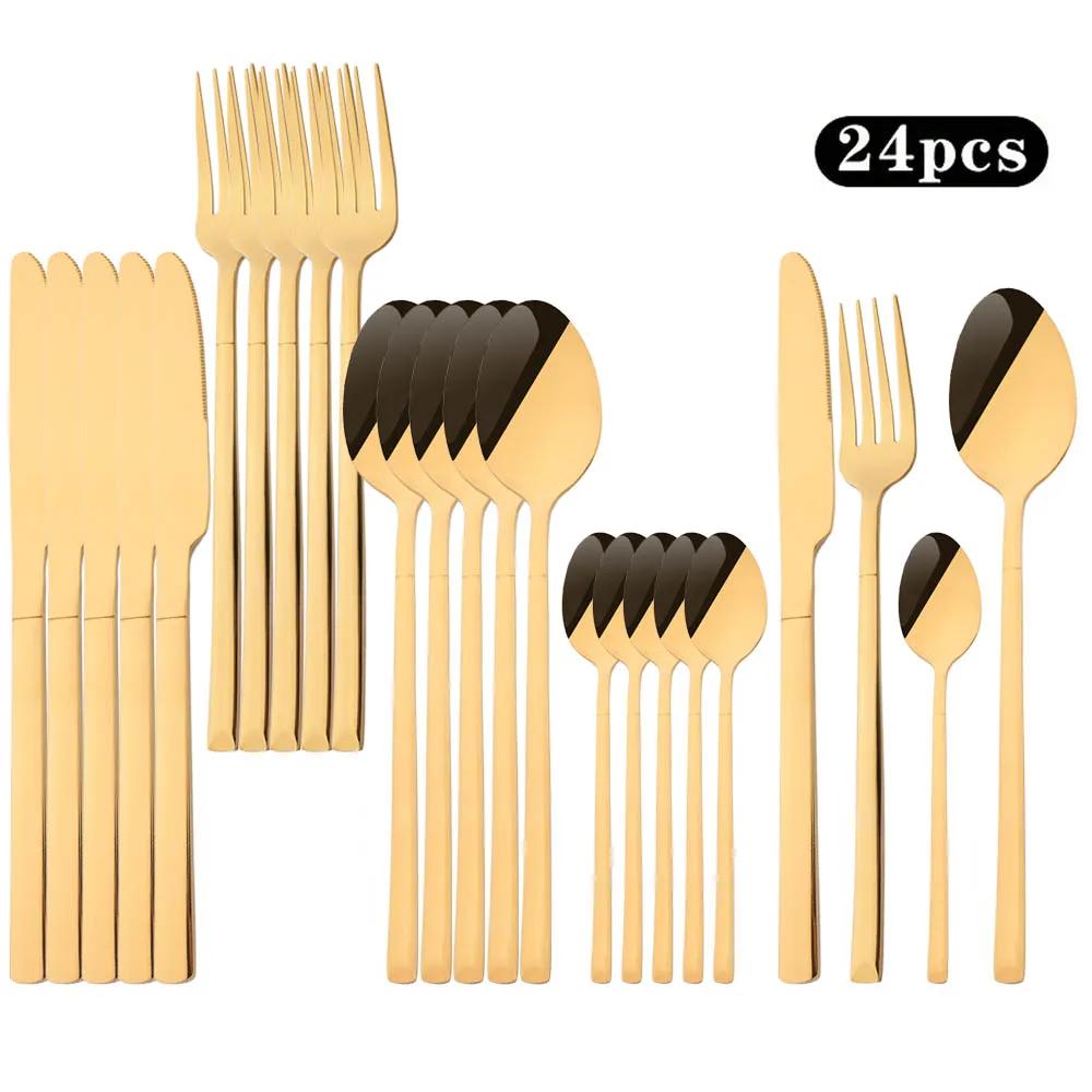 24Pcs Western Gold Dinnerware Set Knife Fork Coffee Spoon Cutlery Set Stainless Steel Flatware Kitchen Silverware Tableware