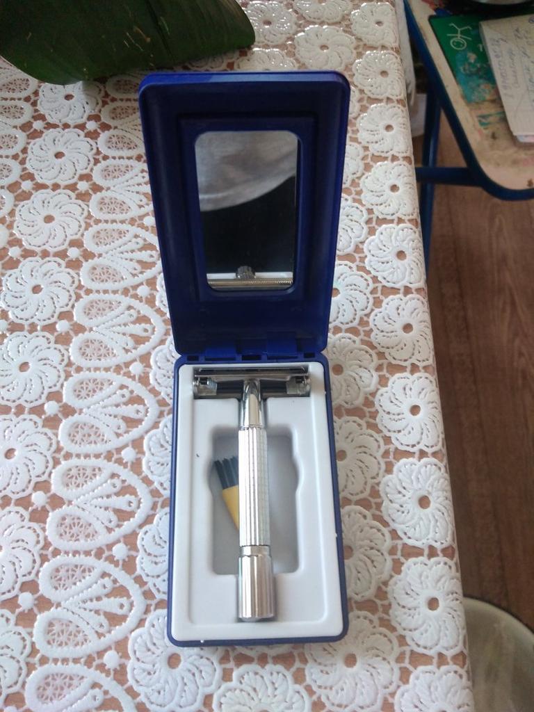 Дождался, наконец получил на почте. Товар, качественный, футляр с зеркалом , внутри помимо бритвы было лезвие и щеточка для чистки. Приобретением остался доволен. Рекомендую продавца