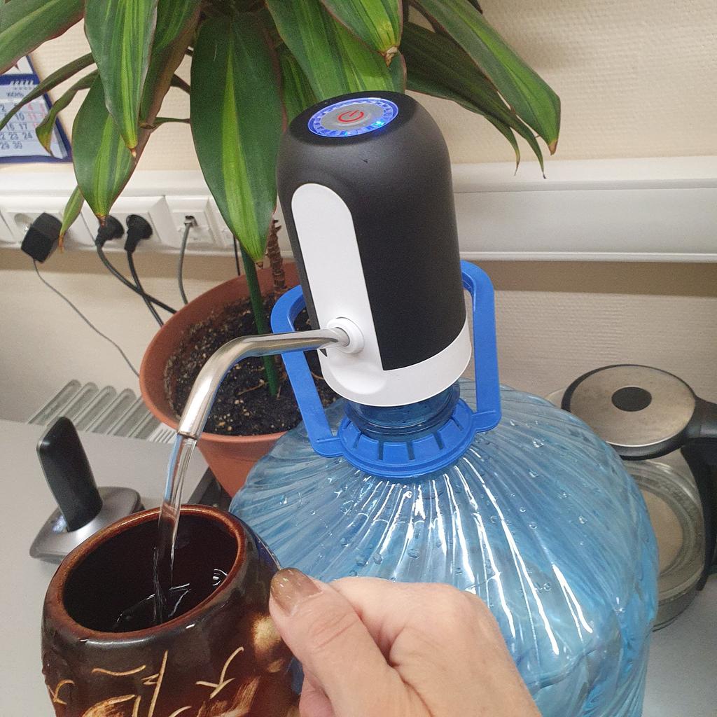 Отличная помпа. Заказ пришел быстро. По фото правда по дизайну другая, мне такая как пришла даже больше понравилась. Она не светится как на фото при наливании и никакой подсветки на верхушке крышки, как на картинке нет.Поставила на зарядку и еле еле увидела, где там мелкая лампочка внутри красная, точка света на фото, как от иголки и только с определенного ракурса видна. А так даже не видно ее. Я сначала даже подумала, что вдруг не заряжает, мол нигде не видно. Когда ставлю на горлышко большого бутыля она свободная, не фиксируется. Если не трогать, а просто нажать кнопку сверзу, то сразу наливает, при наливании воды идет звук от самой помпы, как качает насос маленький. Может надо было одевать на голубую горловину бутыля не убирая, то возможно не болталась бы. Работает отлично)))